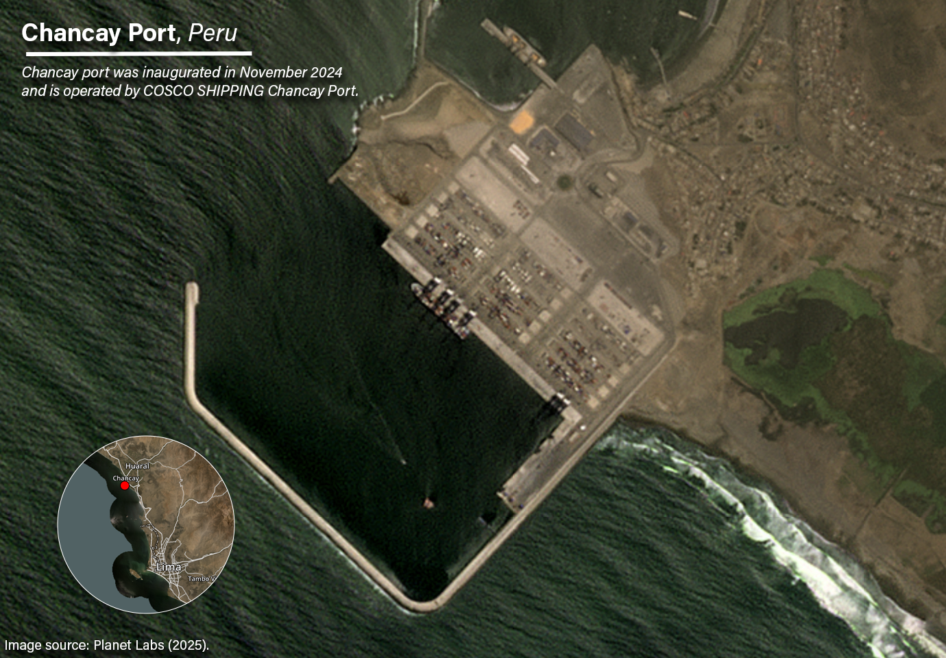 As part of a forthcoming report on China’s global maritime statecraft, I created three geospatial visualizations for the case studies featured in the report. For this image, I looked at the Port of Chancay in Peru, using Planet Labs.